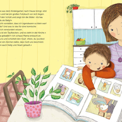 Und über diese meine Agentin bin ich zum großen Herder-Verlag gekommen. Das heißt, der Verlag hat bei meiner Agentin angeklopft und mich als Illustratorin für ein Bilderbuch gebucht. Das war im Herbst 2017. Ich habe den Text für ein Kinderbuch der Autorin Sabine Zett bekommen, es handelt sich um ein Bilderbuch für Kleinkinder über die Taufe. Ich war gleich begeistert und es hat mir riesen Spaß gemacht, diese schöne Geschichte zu illustrieren. Es waren 10 Innenbilder zu zeichnen plus Titelbild. Das Cover musste bis Weihnachten fertig sein, die Innenseiten bis April 2018. Und nun ist es erschienen. Seit August 2018 gibt es das Buch „Beim Taufen kriegt man nasse Haare“ von Sabine Zett und mir im Buchhandel. Was für eine Freude!!!!!!